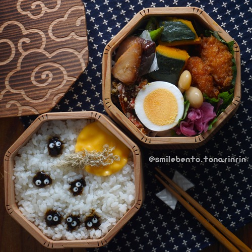 こんにちは。久しぶりに八角のお弁当箱を使いたくなって、海苔アートのカッコいい系を作る予定がなんとなくまっくろくろすけに…やっぱりジブリには勝···