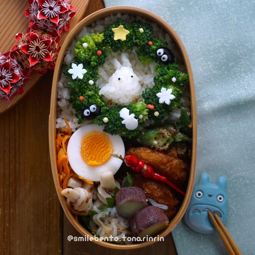 こんにちは。今日のパパさん弁当は…今日は小トトロが主人公のお弁当ですクリスマスリースシリーズの初参加走ってるよ~親友のまっくろくろすけもみん···